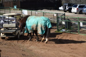 The horses, on the other hand, went for hay wherever they could find it – on the golf carts and elsewhere – and double-checking all the food buckets for remnants left behind. Since Cy goes bat crazy when let out, he runs around frantically and bothers the other horses, Kim put him in the long pen behind the arena. Then Olivia wanted in with him and Kim gave in. They would hang around at the bottom end of the pen. Then one of them would take off toward the high end and back at top speed. They would hang out again, then the other one would take off.