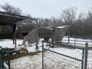 Four day’s into the “ice-apocalypse” we had the misfortune of losing two paddock shed covers to the extreme weight of the ice and snow. Gladly the collapse didn’t harm any humans or horses.. but it did leave us with a major mess. Luckily for us New Hope has a great group of volunteers close by, and a number were able to make it over that afternoon to help clear out the damage and get the paddocks safe for equine occupation. Many thanks Zach, Lee, Kathleen, Curt and Jarmon for braving the icy roads to lend a hand!