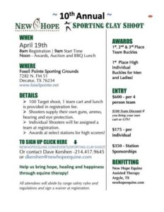 There is still time to register for, or sponsor, the 10th Annual New Hope Sporting Clay Shoot Fundraiser to be held on Saturday, April 19 at Fossil Pointe Sporting Grounds. Come be a part of a day of fun and friendly competition and help New Hope provide services for more riders in the coming year!