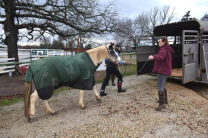 Sunday at around 3 p.m., the crew from New Hope will bring the tack, the hay, everything that’s needed for the temporary paddocks. Volunteers will meet the trailer and help set up the paddocks and tack room.